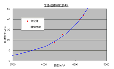超音波法(土研法)では、この様な音速と圧縮強度の関係からコンクリート強度を推定します。 |