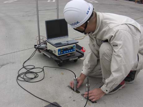 「埼玉県羽生市内ひび割れ深さ調査」 超音波試験により、ひび割れ深さの調査を行いました。 超音波試験によるひび割れ深さの測定方法には、種々の方法が提案されていますが、今回の調査では、音速の計算無しに測定可能な、直角回折波方式により測定しました。 |