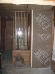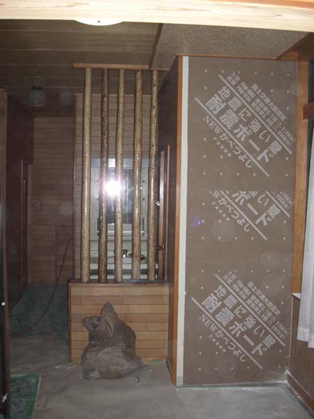 「埼玉県春日部市内 耐震補強工事」 木造住宅の耐震補強工事を行いました。 主に内壁の補強を行い、その性能を高めました。 内壁補強では、既存の床・天井を壊さずに建物の内部壁を取り付けて補強することができるので、外壁補強のような大掛かりな付帯工事が不要です。また、耐震診断・耐震補強設計・耐震補強工事の一環の流れを自社で行いますので、迅速に低コストで行えます。 写真は、内壁補強したものです。この上にクロス張りを行い補強工事を完了します。 |