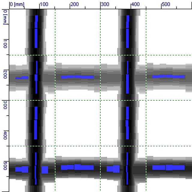 「千葉県多古町内RC構造物 鉄筋探査」 梁内の鉄筋径を確認する事を目的に、電磁誘導法による鉄筋探査を行いました。 電磁誘導法による探査で、鉄筋径の推定が可能です。 写真は、社内試験にて鉄筋径の推定精度を確認した時の探査画像の一例です。測定条件にもよりますが、鉄筋径を推定出来ることを確認しています。 |