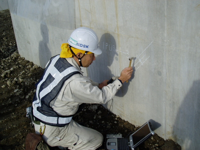「圏央道橋脚下部工非破壊検査」 衝撃弾性波法(表面2点法)により、構造体コンクリートの強度推定を行っています。 |